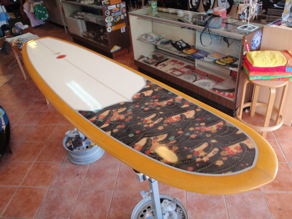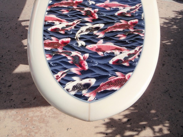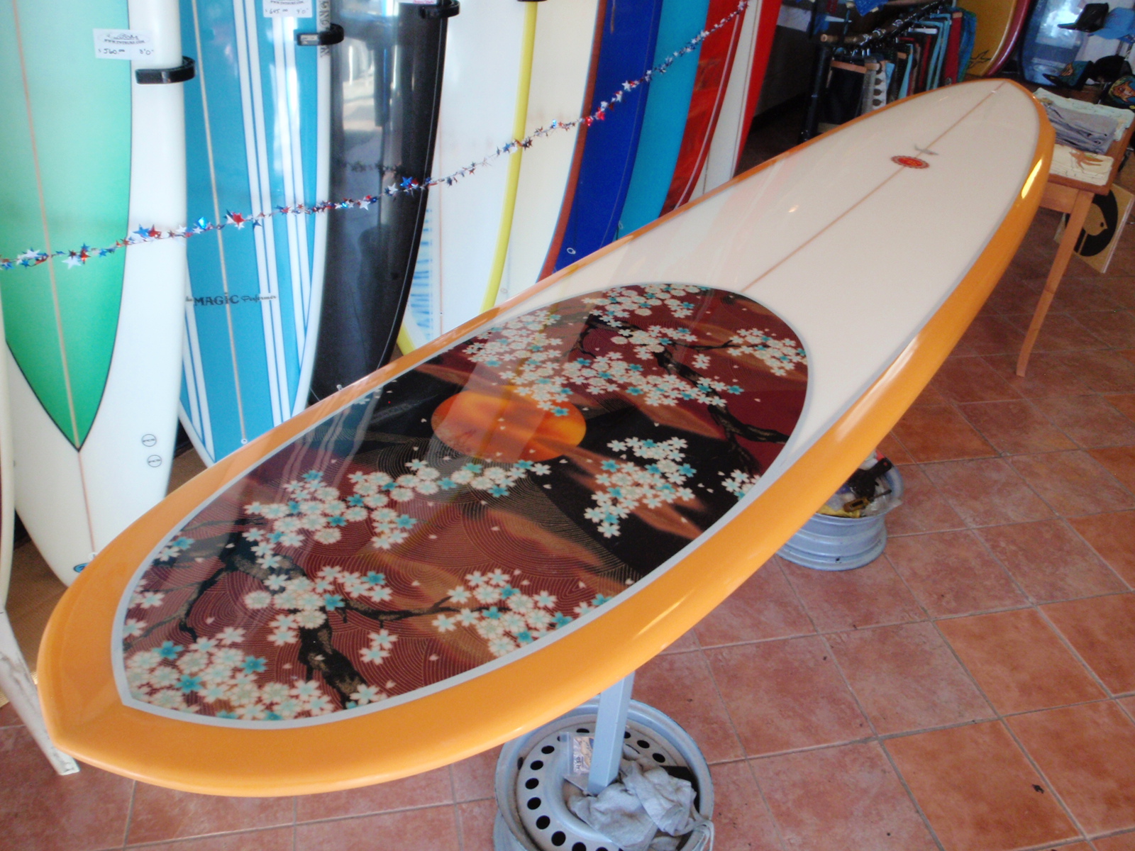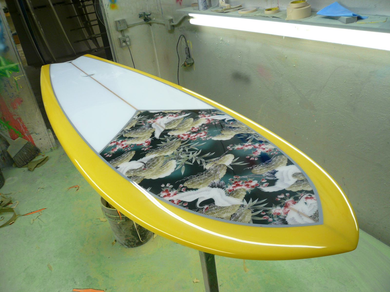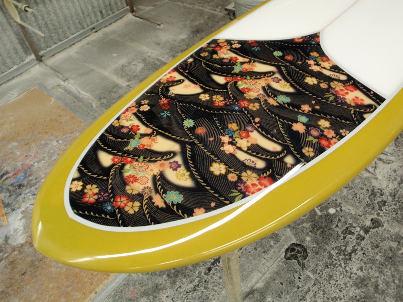 100年以上前、ハワイに移民した日系移民が持参した着物地をローカルの貝のボタンでシャツに仕上げたのがハワイアンシャツの起源とされています。サーフィン発祥の地であるハワイでローカルに愛されてきたシャツに使われた日本の伝統的なデザインである和柄を大胆にサーフボードに採用してみました。ビンテージで スタイリッシュなシェープとは抜群の相性です。ご自身のお気に入りの生地をサーブボードにあしらう事で本当の意味で世界に一本のオリジナルボードが完成します。詳細は是非お問い合わせください。